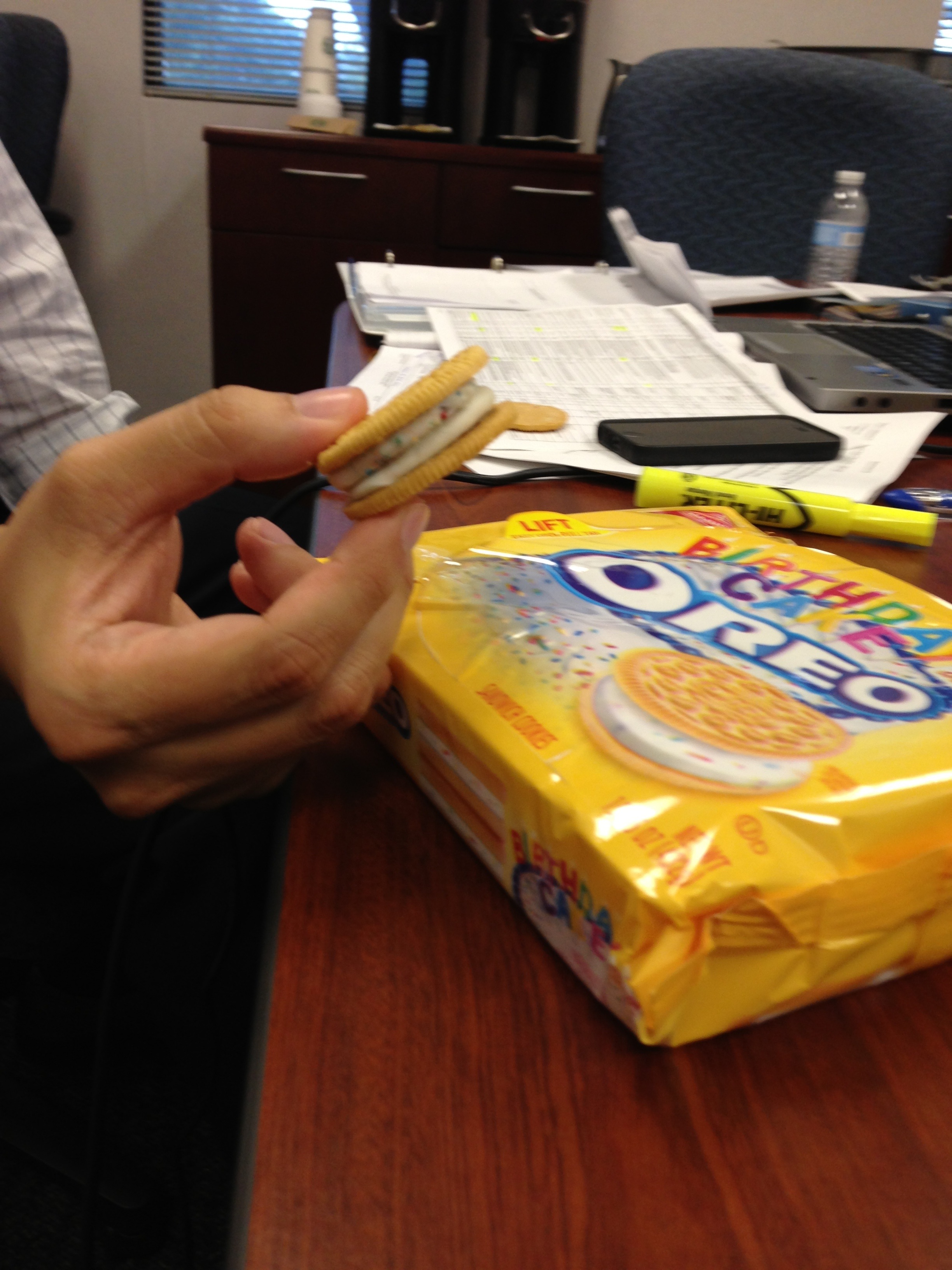 Here’s a little update. The four of us on this project in Tampa demolished an entire row of Oreos in less than two hours. Go team! One of my teammates likes the birthday cake creme filling so much, he made his own mega stuf…